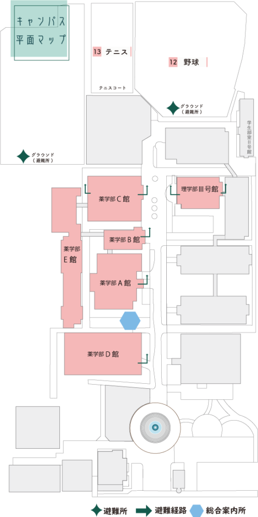Map(新入生歓迎会) 2026 4/01 団体による発表・LIVE 薬学部C館 各団体のブース※4/4(土)のみ。普段の活動場所とは異なります。 薬学部A館 薬学部B館 薬学部D館 薬学部E館 理学部Ⅲ号館 企画一覧
